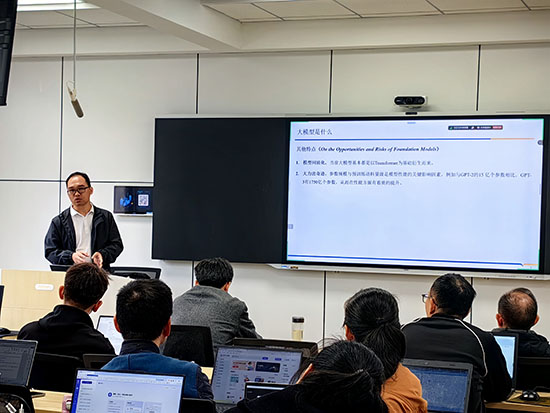 学院院长邓安远、党委书记邹国辉、党委副书记王玉伟、副院长彭虎等班子成员出席开结班仪式。邓安远在开班仪式上作动员讲话,他指出,人工智能技术飞速迭代发展,在一定程度上助推高校在人才培养、专业建设、课程设计等方面加快改革步伐,倒逼教师必须在教学内容、教学手段上进行革新。他强调,国内很多高校已经在推进人工智能通识教育、专业融合、专业整合,而万象城新一轮人才培养方案也对全校计算机课程公共教学提出了改革要求。在这个人工智能技术爆炸式增长的时代背景下,作为新时代的教育工作者,每一位从事计算机专业教育工作的教师都肩负着培养下一代科技人才的重要使命。我们要敢于接受挑战,勇于拥抱新技术,并且善于将这些新技术转化为有效的教学手段,将最先进的人工智能理念和技术融入到日常教学中。希望每位教师都能充分利用这次宝贵的培训机会,深入学习AIGC及大模型相关技术,并思考如何将其有效地结合到自己今后的课堂教学、课程体系中去,创造更多具有创新性的典型教学案例,为学生提供个性化学习体验,激发学生的创新思维,提高应用型人才的培养质量。