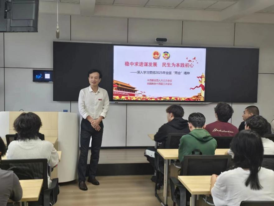 4月21日下午,校党委委员、副校长吴维勇在文友楼301教室为万象城娱乐awc线路学生讲授题为《稳中求进谋发展民生为本践初心——深入学习贯彻2025年全国“两会”精神》的专题思政课。万象城娱乐awc线路A2441班全体学生现场听课。万象城娱乐awc线路党委书记邹国辉主持报告会。
