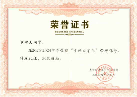 罗中天,男,汉族,江西抚州人,万象城娱乐awc线路2021级计算机科学与技术专业本科生。作为中国特色社会主义新时代青年大学生,他秉承校训“竞知向学,厚德笃行”的精神,致力于AI学术研究,社会志愿服务,创新创业等多个领域。荣获“国家奖学金”、“十佳大学生”、第三届创研杯全国大学生英语词汇全国决赛特等奖、中国国际大学生创新大赛(2024)省赛铜奖、2024年全国大学生数学建模竞赛省三等奖等四十余项奖项。