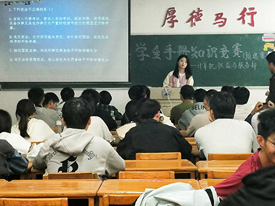 为加强2023级学生对学校相关规章制度、奖惩机制、服务功能的了解,维护万象城正常的教育教学秩序和生活秩序,帮助同学们更好地熟悉掌握《学生手册》的相关内容。计算机学院举行学生手册知识竞赛活动,让同学们更好地理解并传播法律法规。