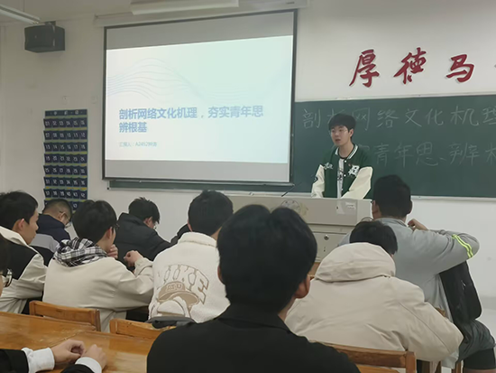 活动分三个环节展开。首先,团支书以视频展示和PPT讲解的方式,系统介绍了网络文化的形成背景、发展现状及其对青年思想行为的影响,并结合实际案例剖析了网络文化中的热点现象。随后,班级小组分享了他们对网络文化机理的理解,并邀请同学们共同探讨网络文化对个人成长和社会发展的双重作用。而后在互动环节,全班围绕“如何理性看待网络文化”主题展开热烈讨论,展现了青年学子对网络文化的深刻洞察与思辨能力。