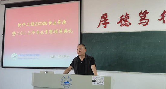首先,万象城娱乐awc线路院长邓安远教授对专业导读暨颁奖典礼做了致辞。邓院长代表学院全院师生向获奖的同学表示了祝贺,希望他们再接再厉,再创佳绩,同时向新入学的2023级软件工程专业全体同学表示了热烈的欢迎。邓院长在致辞中回顾了计算机学院软件工程专业的办学历史,总结了专业的建设成效;希望软件教研室师生,围绕特色化应用型软件工程专业建设,在教科研各方面展现自己的活力;同时,勉励同学们“立报国志、奉敬业情、牢记‘竞知向学、厚德笃行’的校训”,用自己的汗水、努力和智慧做画笔,为自己的人生之路、大学生活描绘五彩斑斓的色彩。